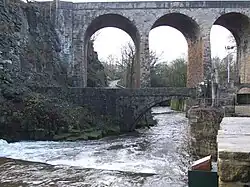 The Union Bridge and the packhorse bridge it replaces. The gritstone strata of the gorge are visible.
