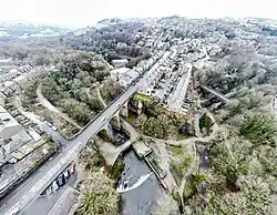 Before the construction of the high-level bridges the Torrs was a major obstacle; traffic had to descend 70 feet (21 m) to cross the Goyt and then climb the same height on the other bank. The first bridge to be constructed was the Queens Bridge on Church Road. The Union Road bridge was built in 1884;[7] obtaining the land was difficult, as the arches needed to pass close to Torr Mill and properties on the Cheshire (south) bank, and Torr Top Hall had to be demolished. The new road was named after the 'union' of the two halves of the town. The first station in New Mills was at Newtown, on the Stockport, Disley and Whaley Bridge Railway; this opened on 9 June 1855. This followed the line of the Peak Forest Canal staying safely away from the Torrs. The Sheffield and Midland Railway Companies' Committee company built two viaducts across the Goyt: one for a line to New Mills Central that opened in 1864, and one for the fast line through the Disley Tunnel which opened in 1904.