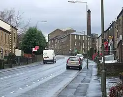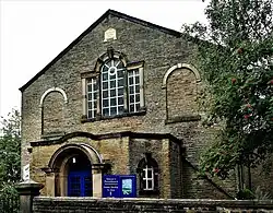 The area around Mellor and New Mills has a strong Methodist tradition. John Wesley first preached in the area in 1740, at a sheepfold at the Bongs in neighbouring Mellor.[4] He visited again on 28 April 1745, 12 May 1747 and 31 August 1748. The Wesleyan Methodists were established in 1748. At first, meetings were held in people's homes; then land was bought on the High Street for a Wesleyan chapel in 1766.[4] This was the first place of worship in the town. Wesley visited again in 1768, 1772, 1774, 1776, 1779, 1782 and 1788.[4] By 1808 that chapel was too small, and a larger one was built in St Georges Road, Brookside (Low Leighton). The church was influential and many of the millowners were members: Samuel Schofield, of Warksmoor House and of Torr Mill, the Armstrongs of Torr Vale Mill, the Hibbert family, including Robert Hibbert, of Warksmoor who built the first cotton mill in Newtown, the Barnes, Thatchers, Arnfields, Bridges, Willans and Bennetts, all industrialists, are buried in the chapel except Robert Hibbert who is buried at St Mary's Slough. The larger chapel was closed and demolished in the 1960s and the Methodists have reverted to the High Street Chapel.[4] The Association Methodists' stone chapel was erected in 1838, and the Primitive Methodists built one in 1827. The Friends Meeting House dating from 1717 is in Low Leighton, and the independents, the Congregational (Independent) church, "Providence", was built on Mellor Road, Whitle, in 1823.[25]