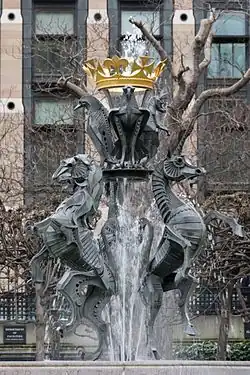 The yard is laid out as a garden with a formal avenue of lime trees, benches of Portland stone and a central lawn surrounded by an oval roadway. Around the outside are a number of old catalpa trees. A fountain in the central lawn was installed in 1977 to commemorate the Silver Jubilee of Elizabeth II and recalls the lost medieval fountain of Henry VI.[1] The fountain stands in an octagonal pool in the centre of which is a large welded steel sculpture by Walenty Pytel. The sculpture is decorated with depictions of birds and beasts from six continents and is surmounted by a gilded crown.[3]