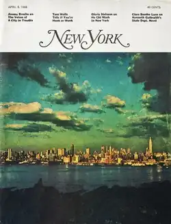 New York was created in 1963[10] as the Sunday-magazine supplement of the New York Herald Tribune newspaper. The Herald Tribune, then in financial difficulty, had recently been sold to John Hay Whitney, and was looking to revitalize its business with an increased focus on editorial excellence, which included a relaunch of the Sunday edition and its magazine. Edited first by Sheldon Zalaznick and then by Clay Felker, the relaunched magazine, called New York, showcased the work of many talented Tribune contributors, including Tom Wolfe, Barbara Goldsmith, Gail Sheehy, Dick Schaap, and Jimmy Breslin.[11] The Tribune went out of business in 1966, and New York was briefly revived as part of a combined paper, the World Journal Tribune, that lasted until May 1967. Shortly after the WJT closed, Felker and his partner, Milton Glaser, purchased the rights to the nameplate, backed by Wall Street bankers led by Armand G. Erpf (the magazine's first chairman, who Felker attributed as the financial architect of the magazine[12][13]) and C. Gerald Goldsmith (Barbara Goldsmith's husband at the time),[3][14][15] and reincarnated the magazine as a stand-alone glossy weekly. Joining them was managing editor Jack Nessel, Felker's number-two at the Herald Tribune. New York's first issue was dated April 8, 1968.[16] Several writers came from the magazine's earlier incarnation, including Breslin, Wolfe (who wrote "You and Your Big Mouth: How the Honks and Wonks Reveal the Phonetic Truth about Status" in the inaugural issue), and George Goodman, a financial writer who wrote under the pseudonym "Adam Smith." Glaser and his deputy Walter Bernard designed and laid out the magazine and hired many notable artists, including Jim McMullan, Robert Grossman, and David Levine, to produce covers and illustrations.