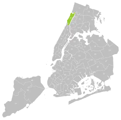 The district overlaps with Manhattan Community Board 12 and, because of Marble Hill (politically part of Manhattan but geographically part of the Bronx), Bronx Community Boards 7 and 8. It is contained entirely within New York's 13th congressional district, and also overlaps with the 30th and 31st districts of the New York State Senate and the 71st and 72nd districts of the New York State Assembly.[5]