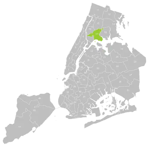 New York City's 17th City Council district is one of 51 districts in the New York City Council. It has been represented by Democrat Rafael Salamanca since a 2016 special election to succeed fellow Democrat Maria del Carmen Arroyo.[3]