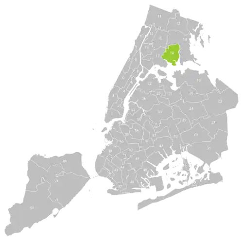 District 18 is based on the eastern shoreline of the East Bronx, covering Parkchester, Castle Hill, Soundview, and Clason Point.[4] Soundview Park is located within the district.