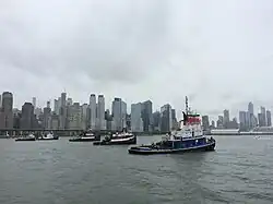 The New York Tugboat Race is a contest for working tugboats held on the Hudson River every Fall on the Sunday before Labor Day. It was founded in part by Captain Jerry Roberts, who also serves as its chief announcer.[1] Boats race one nautical mile from 79th Street to Pier 84 at 44th Street in Manhattan. The race is the occasion for a dockside festival.[1] Events currently include nose-to-nose pushing competitions, a line toss competition, and best mascot/costume contests between the crews.[2] After the award, the spectators of the race can compete in events that include a knot tying competition, an on land line toss competition and a spinach eating competition. The spinach eating competition is in honor of the Popeye the sailor cartoon character. Spectators can also pay to get a seat on a tug boat during the events.[3]