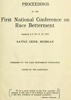 - ^ "Proceedings of the First National Conference on Race Betterment: January 8, 9, 10, 11, 12, 1914, Battle Creek, Michigan". Archived from the original on 2016-04-26. Retrieved 2016-04-19.