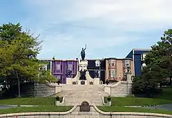 The design was semi-circular with a graduated plateau rising from the entrance stairway on Water Street to the cenotaph on Duckworth Street. The area is near where Sir Humprehy Gilbert claimed Newfoundland for England, almost 400 years earlier.[5] Also, the site has a view of the entire harbour, where all the soldiers left for Europe would have passed though during the First World War.[4] The five figures were designed by two English sculptors, Ferdinand Victor Blundstone (top and sides) and Gilbert Bayes (front), and were cast in bronze by E.J. Parlanti of London, England.These figures represent Newfoundland's involvement in World War I.[6]