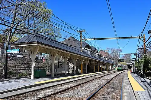 Newton Centre station is a light rail station on the MBTA Green Line D branch, located in the Newton Centre village of Newton, Massachusetts. A former commuter rail station, it was converted for light rail use and reopened on July 4, 1959, along with the rest of the line. The 1891-built station and express office are part of the Newton Railroad Stations Historic District, which was placed on the National Register of Historic Places in 1976.