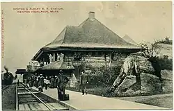 The Brookline Branch of the Boston and Worcester Railroad was extended west to Newton Upper Falls by the Charles River Branch Railroad in November 1852. A flag stop was located at Oak Hill (later Newton Highlands).[2][3] The Boston and Albany Railroad depot was designed by H. H. Richardson in collaboration with landscape architect Frederick Law Olmsted, and was completed in June 1887 shortly after Richardson's death. It was listed on the National Register of Historic Places on June 3, 1976, and is part of the Newton Railroad Stations Historic District.[4] Commuter rail service on the line ended in 1958; it reopened as a light rail station on July 4, 1959.