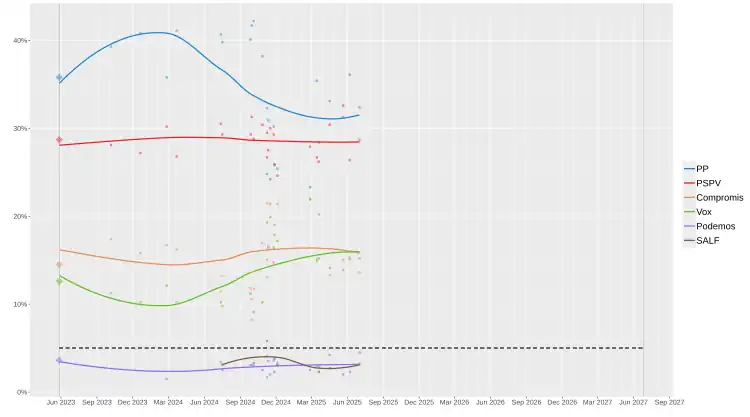 2. ^ "[A] COMUNITAT VALENCIANA. Encuesta SyM Consulting 12/06/2025: PP 36,1% (39/40), PSOE 26,4% (28/30), VOX 15,3% (15/17), COMPROMÍS 15,1% (14/15), UP-EUPV 2,3%, CS 1,1%". Electográfica (in Spanish). 12 June 2025.