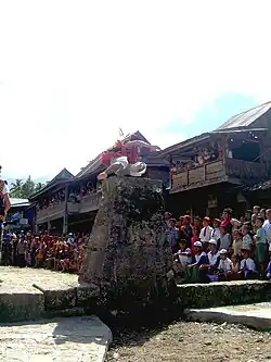 The Nias people are a community that continues living within the norms and practices of their indigenous culture. The customary law of the Nias people is generally referred to as fondrakö, which regulates all aspects of life from birth to death.[3] Historical evidence of megalithic structures and stone carvings that are found in the interior of the island proved that ancient Nias people practiced megalith culture. The caste system is also recognized in Nias society,[4] whereby the highest level out of the 12 levels in the Nias caste system is Balugu.[5] To reach this level of caste, one must be able to carry out big festivals by inviting thousands of people and slaughtering thousands of pigs for several days.