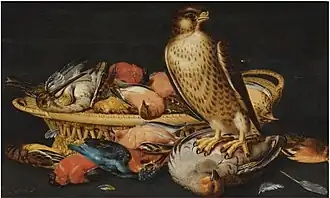 3. ^ Nicolaes Cave, A still life with a live hawk perched on a dead partridge and other dead game in a woven basket at Sotheby's