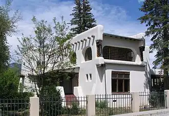 The Nicolai Fechin House in Taos, New Mexico, is the historic home of the Russian artist Nicolai Fechin, his wife Alexandra and daughter Eya. After purchasing the house in 1927, he spent several years enlarging and modifying the two-story adobe structure, for instance, enlarging the porch and adding and widening windows to take advantage of the views. He carved many of the fittings of the house and its furniture, using typical Russian design elements such as "triptych windows and intricately carved doors."[2] The whole reflects a modernist sensibility combined with Russian, Native American, Spanish, and Art Deco traditions.