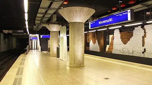 Nieuwmarkt is an underground metro station in the city centre of Amsterdam, Netherlands. Served by metro lines 51, 53, and 54 of the Amsterdam Metro, the station was constructed by sinking caissons with a length of 40 metres (130 ft). This construction method resulted in the demolition of parts of the Nieuwmarkt neighbourhood and was met with protests.