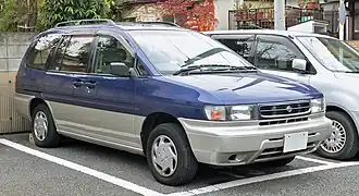 It was originally launched in Japan with a 1.5- or 1.8-litre inline-four engine mated to a five-speed gearbox. Another notable addition to the Japanese market's models was an optional column shifted manual, which allowed for an additional seat in front. This seat had no belt until November 1986, when revised safety rules forced the addition of a waist belt for the middle occupant.[3] A four-wheel drive version followed later in the car's life. An extensive accessories and options list was available in the Japanese Domestic Market, including a kit that effectively turned the vehicle into a campervan. In January 1985 a facelifted version was introduced, with slightly modified engines. These later cars received a new grille treatment and an entirely redesigned rear end: the bumper was now mounted separately to provide more stability after earlier versions had come under criticism for being much too flexible. This redesign also included taller, flush-fit rear side windows. In September 1985 the 4WD model finally appeared, using a larger 2-litre engine and the rear axle from the Nissan Sunny 4WD (B12). A 4WD model had been planned from the beginning,[2] but the original bodyshell's lack of rigidity made Nissan rethink the concept.