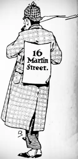 "A detective story that immediately suggests a Sherlock Holmes make-up as illustrated. Get a man dressed in a long and loud Ulster coat or Mackintosh, with a long mustache, a fore-and-aft cap, a big pipe, and a placard on his back with the name of the photoplay as shown. On his breast, let him show a placard with your theatre name and date. People will see that first as they meet him, and they will turn to rubber, getting a flash at the title then."[41]