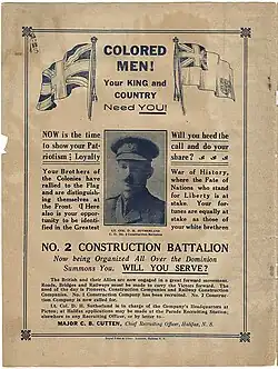 The No. 2 Construction Battalion, Canadian Expeditionary Force (CEF), was raised in Nova Scotia and was one of two predominantly Black battalions in Canadian military history and the only Canadian battalion composed of Black soldiers to serve in World War I.[1][2] Commanded by Lieutenant Colonel Daniel Hugh Sutherland, formerly of the 193rd Battalion, CEF.