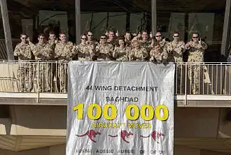 In February 2013, No. 44 Wing and two other former radar wings of World War II, Nos. 41 and 42, celebrated their 70th anniversaries at Williamtown, where the Governor of New South Wales, Marie Bashir, was guest of honour. As of then, No. 44 Wing staff were deployed in Afghanistan.[4] Since its re-establishment in 2000, its detachments have also deployed to Sudan, East Timor, Iraq, the Solomon Islands, and Indonesia.[5]