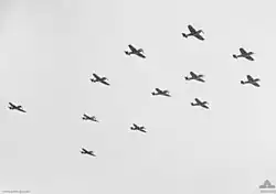 Following the end of the war No. 451 Squadron was deployed to Fassberg and then Wunstorf in Germany as part of the British occupation force. The squadron was deployed to RAF Gatow near Berlin during November and December 1945.[22] While it was intended that No. 451 and No. 453 Squadrons would form a long-term Australian contribution to the occupation of Germany, insufficient RAAF personnel volunteered for this duty to make the deployment viable.[23] As a result, No. 451 Squadron was disbanded at Wunstorf on 21 January 1946. During the war the squadron suffered 28 fatalities, 18 of them Australians.[1]