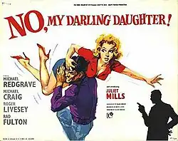 No My Darling Daughter is a 1961 British comedy film directed by Ralph Thomas and starring Michael Redgrave, Michael Craig, Roger Livesey, James Westmoreland, and Juliet Mills.[1] It was written by Frank Harvey based on the play Handful of Tansy by Kay Bannerman and Harold Brooke.
