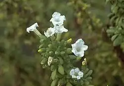 Nolana galapagensis is a small shrub with small fleshy green leaves that are arranged in dense groups along the branches. It has small white flowers.[3]