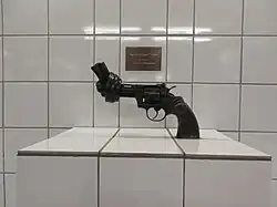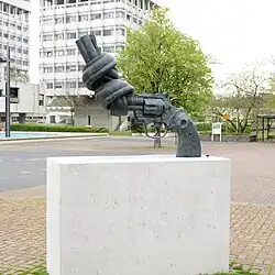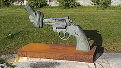 The oversized public version of the piece was planned for John Lennon’s memorial Strawberry Fields in Central Park.[4] This sculpture was made 1984,[5] but when the memorial was opened in 1985 Reuterswärd opted not to have it placed there, citing fears it would be stolen.[2] In 1988, the Luxembourg government bought and donated it to the United Nations. The sculpture was moved right outside of the headquarters of the UN.[6][7] Here it was interpreted not only a memorial for John Lennon, but as a symbol against violence and war anywhere in the world.