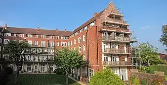 The five-storey building is constructed of brick, with steep tiled roofs, and has an H-shaped plan. The projecting wings are gabled. The building is described by the architectural historian, Nikolaus Pevsner, as "dull between-the-wars semi-modern", with "mild Deco detail".[c] Features include an elaborate corner entrance from Friar Street and a series of French doors with metal balconies on the upper floors. It is fenestrated with metal framed casement windows. There is a sunken garden behind.[7]