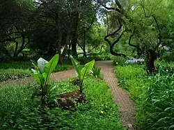 Even though the North-West University Botanical Garden spans less than three hectares more than a 1500 plant species is found here.[1] Most plants in the Botanical Garden are indigenous to South Africa with the exception of a few exotic plants which are kept for research or educational value. A large section of the garden, around a man-made ridge, is managed as a natural wooded grassland area. A variety of theme gardens make up the rest of the Botanical Garden, including the swamp garden, vlei garden, contemporary indigenous garden, vegetable and herb garden, invader display, plant evolution garden and succulent rockery.[1] Some more common plant genera represented in the garden include Acacia, Aloe, Bonatea, Crinum, Dierama, Encephalartos, Eucomis, Eulophia, Euphorbia, Gasteria, Gladiolus, Haworthia, Hypoxis, Indigofera, Kniphofia, Plectranthus, Podocarpus, Polygala, Scadoxus, Searsia, Stapelia and Zantedeschia.