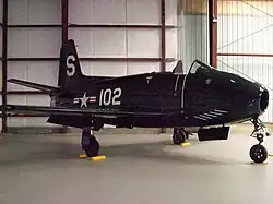The North American FJ-1 Fury is an early turbojet-powered carrier-capable fighter aircraft used by the United States Navy (USN). Developed by North American Aviation (NAA) starting in 1945,[2] it became the first jet aircraft in USN service to serve at sea under operational conditions.[3] This first version of the FJ was a straight-winged jet, briefly operational during the transition to more successful designs. An evolution of the FJ-1 would become the land-based XP-86 prototype of the United States Air Force's enormously influential F-86 Sabre, which in turn formed the basis for the Navy's carrier-based, swept-winged North American FJ-2/-3 Fury.