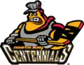 The Centennials new logo from 1999 to 2002 was an angry hockey stick wielding railroad engineer above the name of the team. Home jerseys were white with black and gold trim. Away jerseys were black with white and gold trim. The new jerseys had the previous main logo as shoulder patches.