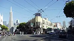 Looking southeast from Columbus Avenue (on the left) and Stockton (on the right). The Transamerica Pyramid is visible in the background on Columbus Avenue. The array of overhead wires supply power for the electric trolley buses such as the one seen on Stockton Street.