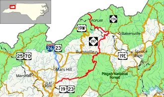 North Carolina Highway 197 (NC 197) is a South-to-North state highway in Western North Carolina. The route is approximately 58 miles (93 km) in length and with its continuation into Tennessee as SR 395 connects Erwin, Tennessee to Flat Creek, North Carolina.[3] Portions of this highway lie within the Pisgah National Forest and is one of the few highways in the state with an unpaved portion.