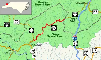 NC 212 is a 14.2-mile (22.9 km) two-lane mountain highway that begins in the community of Belva at NC 208. Traveling in a northeasterly direction, it hugs along the banks of the Shelton Laurel Creek, arriving in the community of White Rock four miles (6.4 km) into the trip. Continuing on, it travels through the heart of the Pisgah National Forest, going between Limestone and Sugarloaf Mountains. At Devil Fork Gap (3,107 ft (947 m), highest point on route), it crosses both the Appalachian Trail and the Tennessee state line, continuing on as SR 352 towards Johnson City.[1]