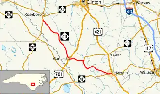 North Carolina Highway 411 (NC 411) is a 27.9-mile-long (44.9 km) primary state highway in the U.S. state of North Carolina. The 28-mile-long (45 km) route connects the towns of Harrells, Garland, and Roseboro, entirely in Sampson County.