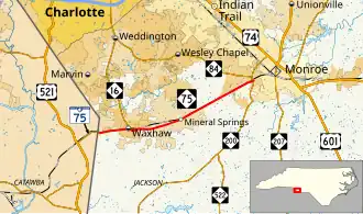 North Carolina Highway 75, also known as the Waxhaw Highway in most of North Carolina (NC 75), is a primary state highway in the U.S. state of North Carolina. Its entire length runs through Union County and serves as the primary connector between the towns of Waxhaw, Mineral Springs, and Monroe. The route roughly parallels a CSX railroad line for its entire span.
