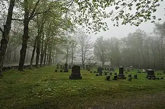 The cemetery's date of establishment is uncertain; its earliest grave marker dates to 1790. A number of the town's founders and early leading citizens are buried there. Graves are laid out generally with older burials in the lower (eastern) end, proceeding up the slope to the west, where 21st-century burials have been made.[2]