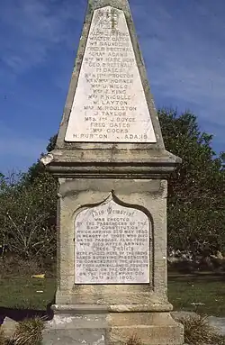 A prominent sandstone obelisk 9.1-metre-high (30 ft) stands on the south-eastern edge of the Station. An obelisk is shown at this location on site plans dating from 1807 to 1809, though it is not known if the existing one is the original. The memorial is in fair condition but requires some stonework repairs at the base. It may prove to be highly significant, if it is the original, as the oldest surviving structure on North Head and one of the oldest on Sydney Harbour. The obelisk is one of the few landscape elements relating to a non-quarantine function, though as navigation markers they relate to the overall maritime themes that include quarantine.[1]