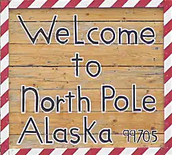 North Pole is a small city in the Fairbanks North Star Borough, Alaska, United States. Incorporated in 1953, it is part of the Fairbanks metropolitan statistical area. As of the 2020 census, the city had a population of 2,243,[2] up from 2,117 in 2010.[3] Despite its name, the city is about 1,700 miles (2,700 km) south of Earth's geographic North Pole and 125 miles (201 km) south of the Arctic Circle.