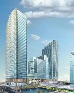 In 2017, a new masterplan was developed by Allies and Morrison,[7] now consisting of four towers of 30 to 67 floors.[8] Consultation with local stakeholders and the public was held between October 2019 and March 2020, and planning permission was granted in March 2022. "Reserved matters" for North Quay development first tower were approved in July 2023. Compared to the original proposal, the new masterplan reduces the emphasis on large-floorplate offices designed for large companies, with more flexible spaces which could have a variety of uses, including life-sciences laboratories or residential.[7]