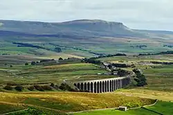 The centre of the county contains a wide plain, called the Vale of Mowbray in the north and Vale of York in the south. The North York Moors uplands lie to the east, and south of them the Vale of Pickering is separated from the main plain by the Howardian Hills. Further east, the county has a coastline on the North Sea. The west of the county contains the Yorkshire Dales, an extensive upland area which contains the source of the River Ouse/Ure and many of its tributaries, which together drain most of the county before reaching the Humber estuary in the south. The Dales also contain the county's highest point, Whernside, at 2,415 feet (736 m).[4]