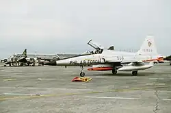 After winning the International Fighter Aircraft Competition, a program aimed at providing effective low-cost fighters to American allies, in 1972 Northrop introduced the second-generation F-5E Tiger II. This upgrade included more powerful engines, larger fuel capacity, greater wing area and improved leading-edge extensions for better turn rates, optional air-to-air refueling, and improved avionics, including air-to-air radar. Primarily used by American allies, it remains in US service to support training exercises. It has served in a wide array of roles, being able to perform both air and ground attack duties; the type was used extensively in the Vietnam War.[2] A total of 1,400 Tiger IIs were built before production ended in 1987. More than 3,800 F-5s and the closely related T-38 advanced trainer aircraft were produced in Hawthorne, California.[3] The F-5N/F variants are in service with the United States Navy and United States Marine Corps as adversary trainers.[4] Over 400 aircraft were in service as of 2021.[5][N 1]
