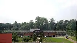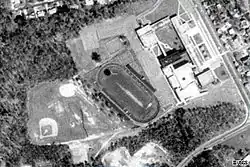The school has six tennis courts located just outside the auditorium to the east of the building and it has several basketball courts located at the rear of the building outside the food court, which have been decommissioned and now serves as an area which houses several of the school's portable classrooms. There are three athletic fields in the rear of the building: the football/soccer stadium, which also encompasses the running track which surrounds the football/soccer field; a softball field, and a baseball field.[3]