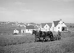 Basically the government purchased the land and people built their own homes on a lease-to-purchase agreement. Families rented their homes from the government for $12 to $14 a month, which was applied to the future purchase price of the house.[5] By 1946, all the renters had purchased their homes. These early homes had everything a family would need to survive. These amenities included a grape arbor, 3-4 acres of land to plant a garden, and chicken coops.[8] To make construction as efficient and cost-effective as possible, the division assigned crews to a single, specific construction task, such as digging the foundation or installing flooring—thus anticipating the mass building methods that would characterize large-scale residential developments such as Levittown after World War II—and applied most of workers' wages directly to the cost of their homesteads.[4] After a resident's home was built, the government then provided each family with a wheelbarrow, rake, hoe and shovel. Mounds of earth were then dumped in front of the houses, and the tenants prepared their own lawns. Families were also expected to paint their own homes. Their choices of paint were white, gray or yellow.[9] In May 1935, the first families began moving into Westmoreland Homesteads, and the task of creating a community began. Under the direction of a community manager, homesteaders established garden plots and raised livestock, including hogs and chickens. Some families produced enough to sell their surplus at a market, but for most, subsistence farming failed to meet their needs. To remedy the situation, in 1939, administrators at the Division, now under the "Rural Resettlement Administration", approved a loan for the construction of a small garment factory on site. Administered by the "Cooperative Association", a non-profit entity which also operated a cooperative store and a community health center, the garment factory by 1940 employed around 150 men and women.[4][9]