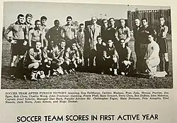 The Irish soccer team was started as a club sport in 1961 by Joe Echelle and Faculty Advisor Mr. Christopher Fagan. The club was made up students representing five continents and was a manifestation of the increasing popularity of soccer as a college sport. The team posted a respectable inaugural 3–2 record winning games against Indiana Tech, Goshen College and Purdue[6]