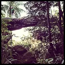 Ponte de Pedra - Nova Olinda, CEPonte de Pedra: Geosite Ponte de Pedra is located in Sítio Olho D'água de Santa Bárbara is a remarkable site in the landscape, with a beautiful panoramic view, located in the municipality of Nova Olinda, on the descent of Chapada do Araripe. It is represented by a natural rock formation that resembles a bridge, as it covers the gap of a stream that only has water in times of rain. It delimits an area between the Chapada de Araripe, with its abundant forest and the culture of collecting pequi, and the Sertão, which can be seen on the way down. The bridge probably served as a trail for the ancient populations, both for the Indians and for the former cowboys who colonized the region. Near the bridge, there are archaeological remains of prehistoric populations. There are engravings and cave paintings, as well as occasional finds of ceramic remains and lithic material used by the ancient Kariri inhabitants. It is one of the places where the geological and natural past can be studied together with human history.