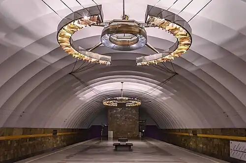 Novocherkasskaya (Russian: Новочерка́сская) is a station on the Line 4 of Saint Petersburg Metro, opened on December 30, 1985. The station was planned to be named Zanevskaya, but it was ultimately called Krasnogvardeyskaya until 1992; the station's name was changed after its namesake, the Krasnogvardeysky Avenue, was renamed to Novocherkassky.[1][2] The station is unique as it does not have its own building above ground; one must enter through an underground pedestrian crossing.[2][3]