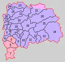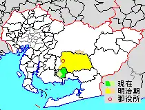 * yellow - areas formerly within the district borders during the early Meiji period