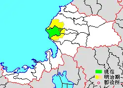 * yellow - areas formerly within the district borders during the early Meiji period