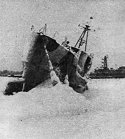 From 1959 to 1963 Kompas underwent a major retrofit at the Polish Navy Shipyard.[1] At the end of December 1971 the ship was converted to a military hotel quarters barge BK-4 at Gdynia shipyard.[1] In 1977 it was designated to salvage.
