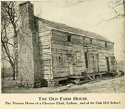 In 1878, a carpenter, George M. Dallas, was hired by the Presbyterian Board of Missions for Freedmen to build a schoolhouse and upon its completion began teaching a day school in the building.[14] In 1884, because there was an inadequate water supply, the school was transferred to a log house in section 29, about a mile and a half northwest of the original location.[17] In 1886, the Mission Board hired a teacher, Eliza Hartford from Steubenville, Ohio to take over instruction at the school. Hartford had previously taught in Cedar City, Utah[18] from 1881 to 1885.[19] With her arrival, the school relocated yet again to a log home which had formerly been the home of Chief LeFlore. Rather than stay with a church member and make the 3-mile journey to and from the school daily, Hartford moved into the school with 24 students on 15 April 1886, beginning the boarding school.[20] Due to illness Hartford resigned in 1889[21] but the girl's hall she had advocated for was completed.[22] In 1893 a boy's hall was completed and by 1895 both a laundry and smokehouse were built. In 1902, the schoolhouse was moved and a second story was added, so that it would be nearer the railway and water would not have to be hauled the 1+1⁄2 miles from the nearest water source,[23] Clear Creek, as the well on the property had run dry.[24]